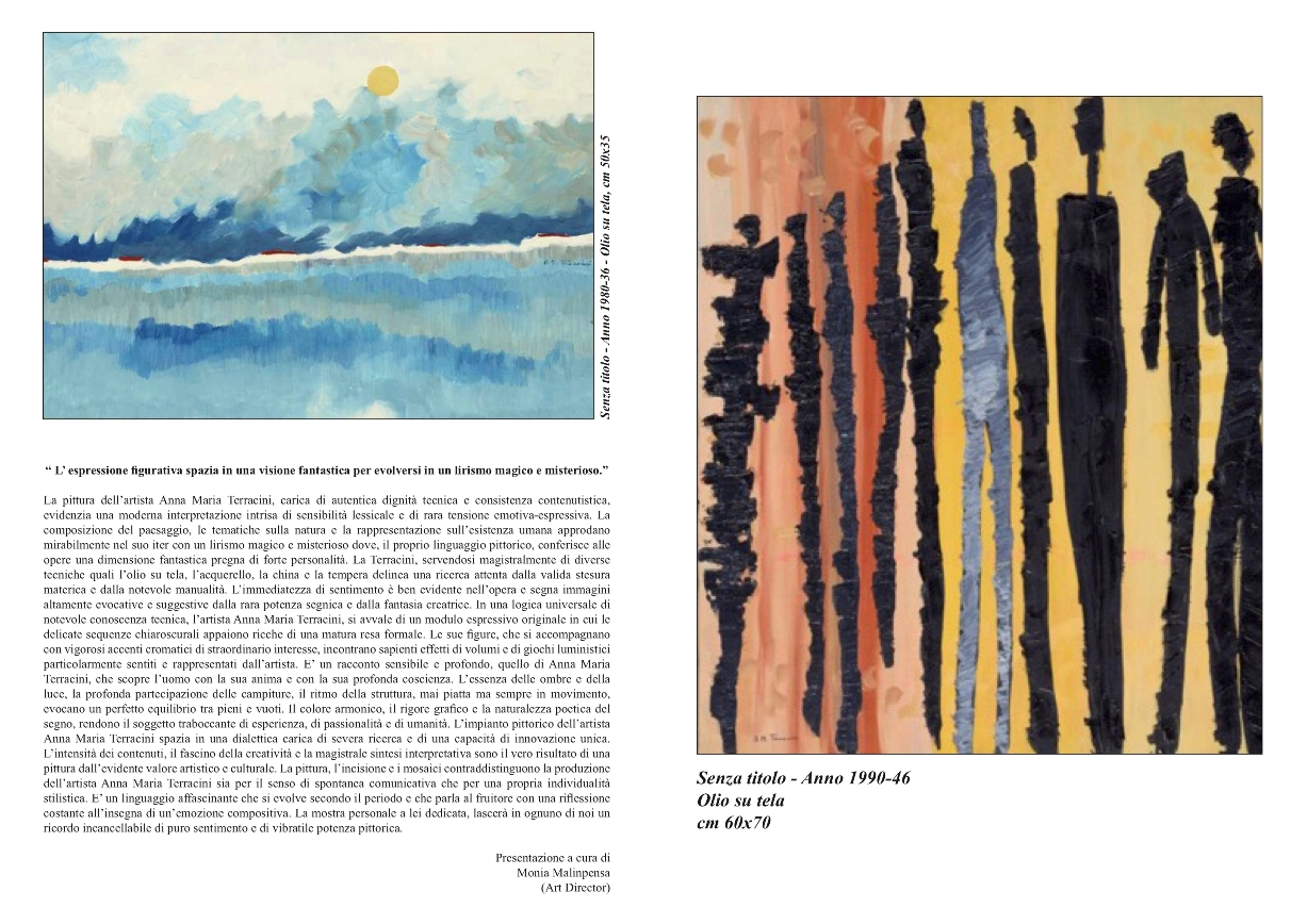 La pittura dell’artista Anna Maria Terracini, carica di autentica dignità tecnica e consistenza contenutistica, evidenzia una moderna interpretazione intrisa di sensibilità lessicale e di rara tensione emotiva-espressiva. La composizione del paesaggio, le tematiche sulla natura e la rappresentazione sull’esistenza umana approdano mirabilmente nel suo iter con un lirismo magico e misterioso dove,il proprio linguaggio pittorico, conferisce alle opere una dimensione fantasticapregna di forte personalità. La Terracini, servendosi magistralmente di diverse tecniche quali l’olio su tela, l’acquerello, la china e la tempera delinea una ricerca attenta dalla valida stesura materica e dalla notevole manualità. L’immediatezza di sentimento è ben evidente nell’opera e segna immagini altamente evocative e suggestive dalla rara potenza segnica e dalla fantasia creatrice. In una logica universale di notevole conoscenza tecnica, l’artista Anna Maria Terracini, si avvale di un modulo espressivo originale in cui le delicate sequenze chiaroscurali appaiono ricche di una matura resa formale.Le sue figure, che si accompagnano con vigorosi accenti cromatici di straordinario interesse, incontrano sapienti effetti di volumi e di giochi luministici particolarmente sentiti e rappresentati dall’artista. E’ un racconto sensibile e profondo, quello di Anna Maria Terracini, che scopre l’uomo con la sua anima e con la sua profonda coscienza. L’essenza delle ombre e della luce, la profonda partecipazione delle campiture, il ritmo della struttura, mai piatta ma sempre in movimento, evocano un perfetto equilibrio tra pieni e vuoti. Il colore armonico, il rigore grafico e la naturalezza poetica del segno, rendono il soggetto traboccante di esperienza, di passionalità e di umanità. L’impianto pittorico dell’artista Anna Maria Terracini spaziain una dialettica carica di severa ricerca e di una capacità di innovazione unica. L’intensità dei contenuti, il fascino della creatività e la magistrale sintesi interpretativa sono il vero risultato di una pittura dall’evidente valore artistico e culturale.La pittura, l’incisione e i mosaici contraddistinguono la produzione dell’artista Anna Maria Terracini sia per il senso di spontanea comunicativa che per una propria individualità stilistica. E’ un linguaggio affascinante che si evolve secondo il periodo e che parla al fruitore con una riflessione costante all’insegna di un’emozione compositiva. La mostra personale a lei dedicata, lascerà in ognuno di noi un ricordo incancellabile di puro sentimento e di vibratile potenza pittorica.