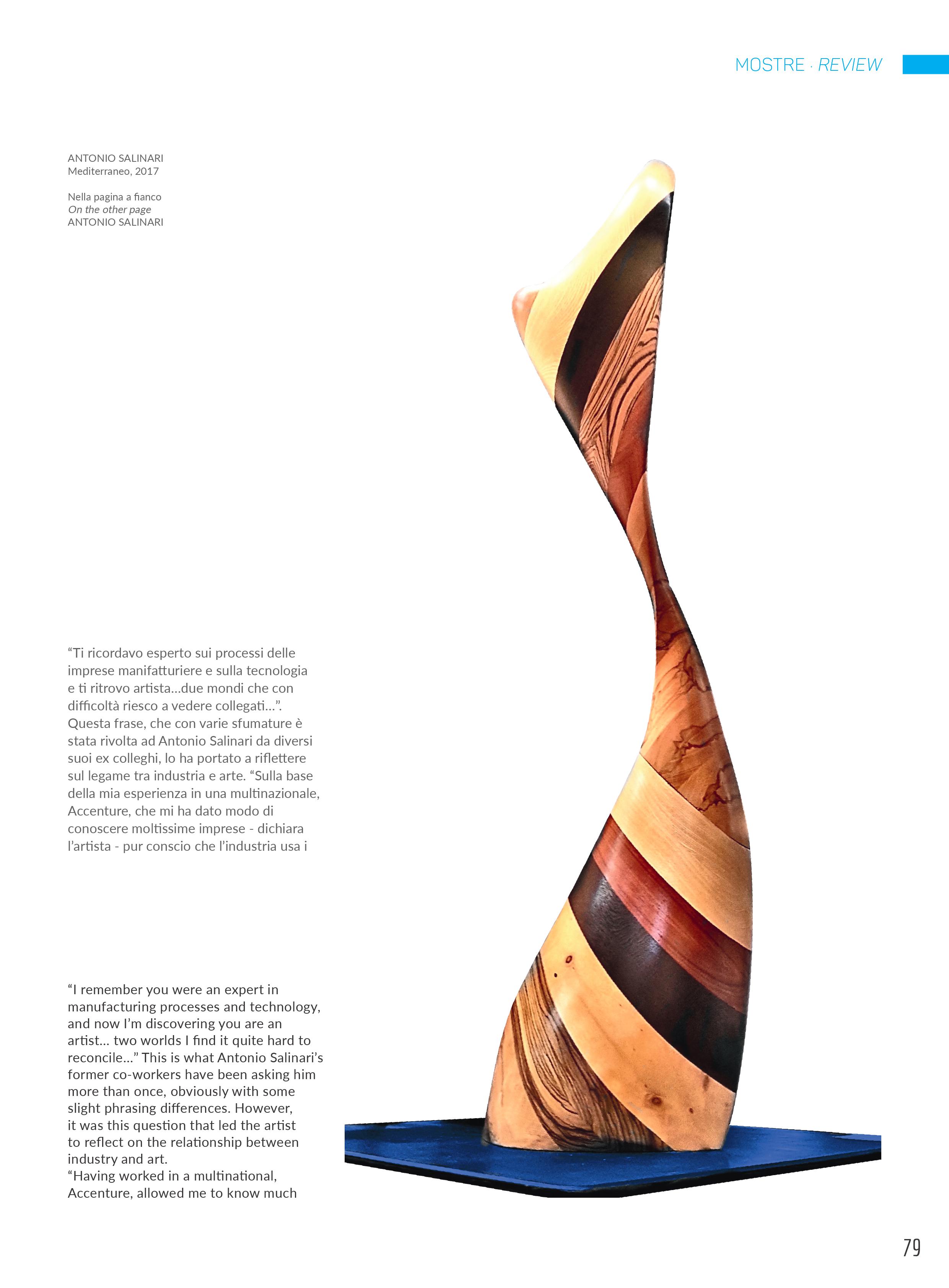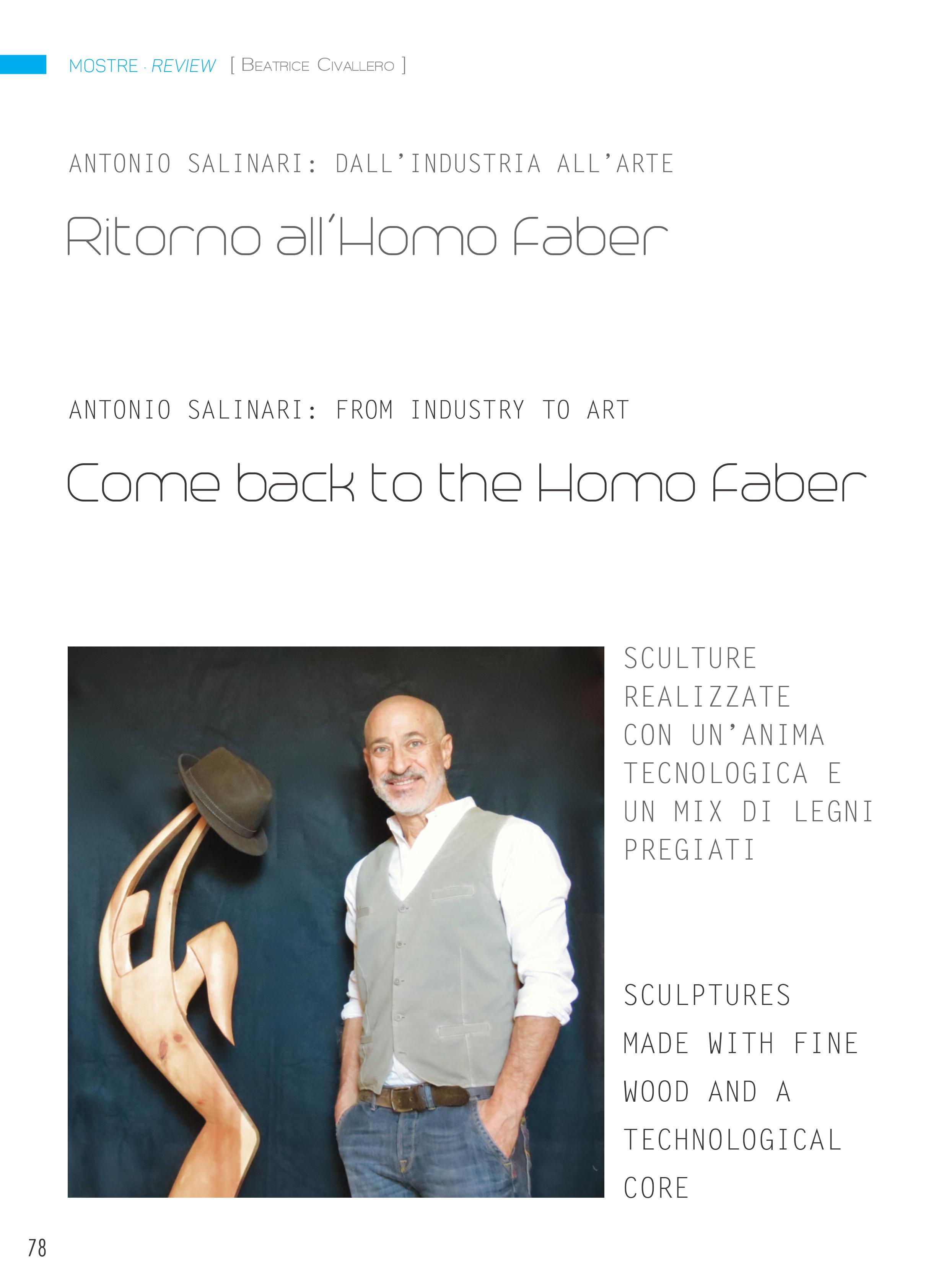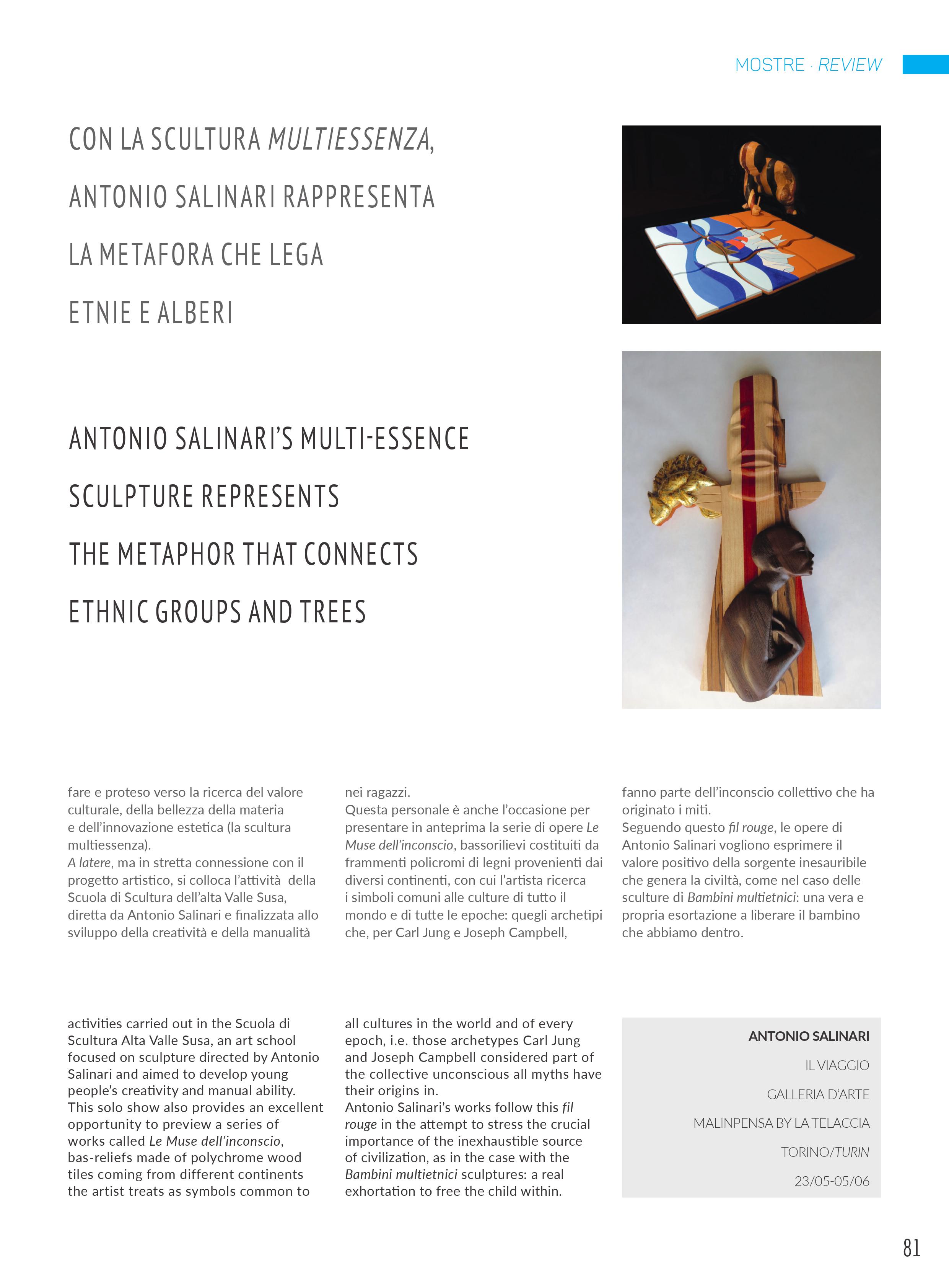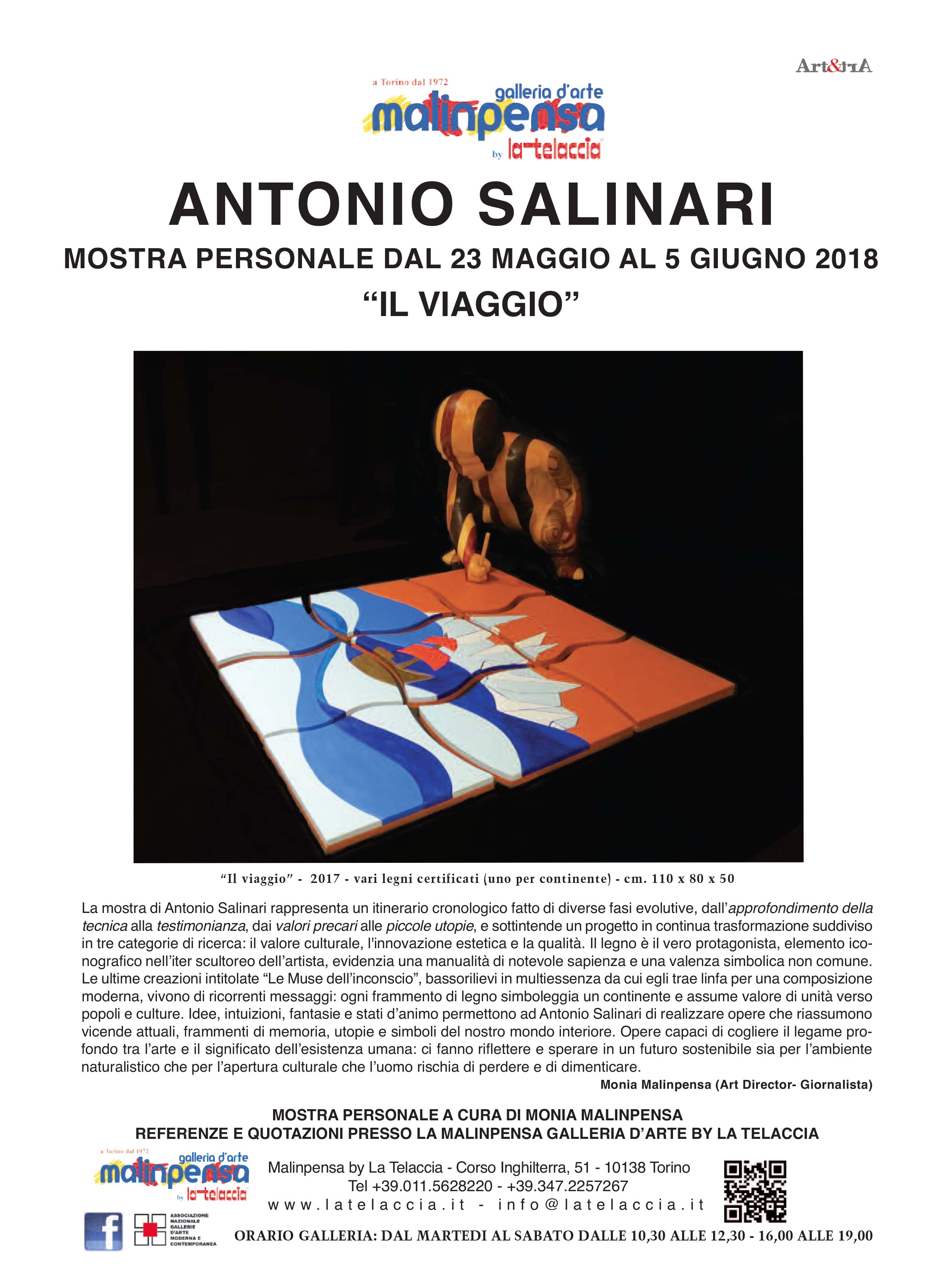In una totale armonia con la natura si racconta l’operare dell’artista Antonio Salinari; nel suo lavoro ben visibile e tattile, si individua in primo piano una costruzione meticolosa ed impegnativa che, costantemente interiorizzata da un profondo pensiero filosofico, sociale e culturale, si potenzia in un percorso di forte vitalità manuale e creativa ed in una ricerca di grande impatto. Egli, in una continuità di sperimentazione pura ed autonoma, è capace di suscitare un contesto narrativo d’autentica analisi che si amplia in quattro fasi e che documenta l’intero suo iter. Ed ecco le fasi della sperimentazione, della testimonianza, della proposta di valori e della ricerca della stabilità da cui risuona un proprio vissuto che ci invita alla riflessione. Il legame tra passato e presente lascia traccia di memoria e caratterizza l’opera di una singolare suggestività e di una notevole funzione della forma sia simbolica che metaforica. Emergono dall’operato del Salinari una scala di valori elevati e sinceri che si librano in una dimensione emotiva e spirituale di particolare rilievo. Il versante dell’invenzione, il connubio tra la tecnologia e l’esistenza umana, ed il rispetto per l’ecosistema evidenziano una contemporaneità emozionante ed interessante da seguire attentamente. La bellezza della materia, essenza sublime, si orienta in un flusso creativo e fantasioso di particolare abilità dove stile ed eleganza si evolvono magistrali. Prende vita da “Verità precarie” l’opera “Angelus Novus ” in cui la concretezza dell’impianto tecnico-formale -, i giochi volumetrici dei frammenti modulari, scomponibili e ricomponibili tra loro, e l’innovazione della figura intercambiabile si muovono a seconda dello stato d’animo. Il fascino dell’elemento naturale del legno, espresso con varie forme dinamiche mai statiche, evidenzia un sistema funzionale e strutturale ingegnoso che gioca sulla composizione e scomposizione della figura in una discorsività scenico – ambientale di attenta comunicativa. Il piacere qualitativo della rappresentazione e l’utilizzo del legno, nobile e rinnovabile, si fondono l’uno all’altro in un cammino inconfondibile fatto di forza, valori e di una materialità magica ed entusiasmante. Il dialogo, che egli stesso instaura con la materia, è di immediata identificazione; la purezza del legno, con il suo profumo intenso e genuino che interpreta la vita di oggi e quella passata, è capace di coinvolgere vari aspetti simbolici, morali, sociali e culturali che coinvolgono profondamente il lettore. L’intenzione da parte del Salinari è soprattutto quella di evidenziare i valori perduti da parte dell’uomo e lo fa con un suo autonomo sperimentalismo altamente ideativo e fortemente umanistico. La validità tecnica, sapientemente elaborata, crea un’esperienza sensoriale e tattile del tutto unica mentre la ricerca complessa nel recupero di vari materiali da lui usati quali legni, acciaio, juta, plexiglass, pietra e filati, ed il loro assemblaggio, forma una linea armonica di pensiero e di modernità espressiva unica, tanto da infondere all’opera un’energia non comune. Disegno, fotografia, scultura, arazzi in 3-D, ricami, illuminazione, gioco e arredamento dialogano in un’ illustrativa ricca di identità e di ritmo compositivo, sia per l’accostamento dei materiali che per la loro notevole rappresentatività. Nelle opere scultoree “ Icarus”, “ Musae” e il “ Volo” troviamo un perfetto equilibrio tra i pieni e i vuoti dove la ritmica imponente dei volumi e le superfici lisce e ben modellate del legno rivelano un proprio impianto formale ed una capacità di rara sintesi. Le sue opere, che appaiono ambientate ed inserite in diverse tematiche dal sociale al concetto di bellezza universale dell’opera stessa, si materializzano in un percorso assolutamente ricco di personalità sempre caratterizzato da una forte spiritualità e da analisi continua della realtà. E’ un linguaggio, quello del Salinari, che va al di là della rappresentazione visivo estetica; nel suo iter si muovono figure nuove come “ i Guardiani del giardino”, che lasciano il segno nella terra e che, dense di effetti mosaici, si animano di fantasia, di movimento e di rinnovata creatività. C’è un potere liberatorio nella rappresentazione scultorea del Salinari; egli, instancabile sperimentatore, lavora con entusiasmo il legno in un processo esistenziale- culturale che lo distingue. Nell’opera intitolata “ Paradosso sospeso”, tratto da “Idee senza ombre” , l’artista fa rivivere la materia con un flusso vitalistico e con un’originalità senza imitazioni, in un’unità affascinante di vibrazioni e luci dove l’essenza dello spazio scenografico crea una molteplicità di effetti emozionali. In una splendida sequenza di stile e di rigore il legno vive in tutta la sua identità di una costruzione idealistica, analitica e manualistica di incisiva formulazione in cui si riconoscono gli autentici valori sia artistici che umani tradotti in opera d’arte. Il piacere di raccontare e di raccontarsi è senza dubbio fondamentale per il Salinari. Nasce attorno al suo operare un sentimento vero, capace di muovere l’animo dello spettatore; punto di forza dell’artista.Ed è così che il Salinari mette a nudo varie prospettive della realtà, arrivando a toccare anche l’aspetto dell’arredamento con la serie “ Doxa” in cui si riconosce appieno la genialità; egli elabora con sapiente maestria vari legni con capacità tecnica e con un’evoluzione stilistica d’immagine assolutamente originale. La sintesi e la versatilità della materia ruotano costantemente intorno al suo iter determinandone una carica fondamentale di sensazioni e di vissuto dalla notevole valenza sentimentale. L’ultima fase di ricerca della stabilità, espressa sul concetto di bellezza secondo la concezione greco- antica, esalta una resa formale di rara suggestione che brill