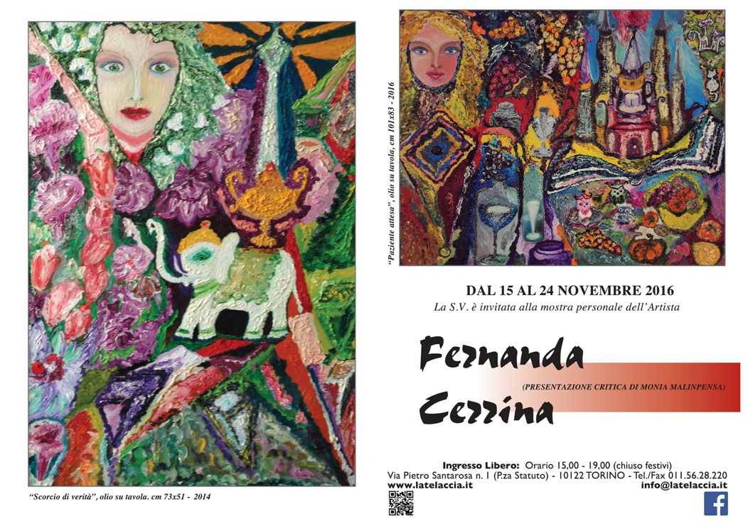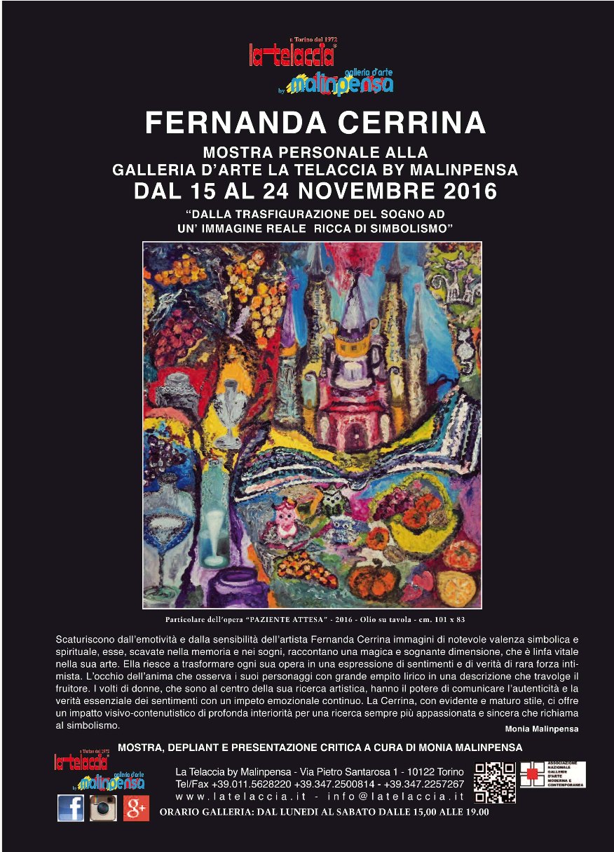 Scaturiscono dall’emotività e dalla sensibilità dell’artista Fernanda Cerrina immagini di notevole valenza simbolica e spirituale, esse, scavate nella memoria e nei sogni, raccontano una magica e sognante dimensione, che è linfa vitale nella sua arte. Ella riesce a trasformare ogni sua opera in una espressione di sentimenti e di verità di rara forza intimista. L’occhio dell’anima che osserva i suoi personaggi con grande empito lirico in una descrizione che travolge il fruitore. I volti di donne, che sono al centro della sua ricerca artistica, hanno il potere di comunicare l’autenticità e la verità essenziale dei sentimenti con un impeto emozionale continuo. La Cerrina, con evidente e maturo stile, ci offre un impatto visivo- contenutistico di profonda interiorità per una ricerca sempre più appassionata e sincera che richiama al simbolismo. Pittura poetica ma vigorosa, quella della Cerrina, vissuta da parte dell’artista con molte vibrazioni emozionali dai risultati sorprendenti e suggestivi dove il grande amore per la vita e la carica emotiva affermano la sua sensibilità. Sognatrice, realista e fantasiosa di rara capacità la Cerrina, attraverso un modo di dipingere unico, evoca gli spazi della psiche e dell’animo con forza interpretativa e propria identità. Con una vasta gamma cromatica ed un uso vivace ed intenso del colore, ella crea una moltitudine di effetti preziosi e luminosi che si accendono di una ricca terminologia coloristica e spazio scenico. La struttura forte e dinamica ed il senso della composizione vivono un ruolo fondamentale ed esclusivo all’interno dell’opera. La materia dell’olio su tavola, che ella predilige per le sue rappresentazioni, si anima di abilità tecnica e di un linguaggio stilistico personale in piena aderenza con i valori e le emozioni. Sono opere in continua evoluzione che acquistano forza, energia ed effetti percettivi notevoli e che vanno al di là del significato estetico perché palpitanti di vibrazioni esistenzialistiche e psicologiche profonde. La Fernanda Cerrina che, con attenta sensibilità e ricchezza di sentimenti, ci invita nel suo mondo per ascoltare l’anima delle sue figure femminili, esprime una pittura spontanea esaltata da un atto d’amore ricorrente per la vita. Ella costruisce con un’intima e poetica visione una rilevante tematica dalla quale si coglie un’espressione istintiva originale realizzata autonomamente con un impianto pittorico altamente suggestivo. Ogni sua opera è un’esperienza sensoriale e un messaggio di spiritualità che travolge l’osservatore con grande intensità.