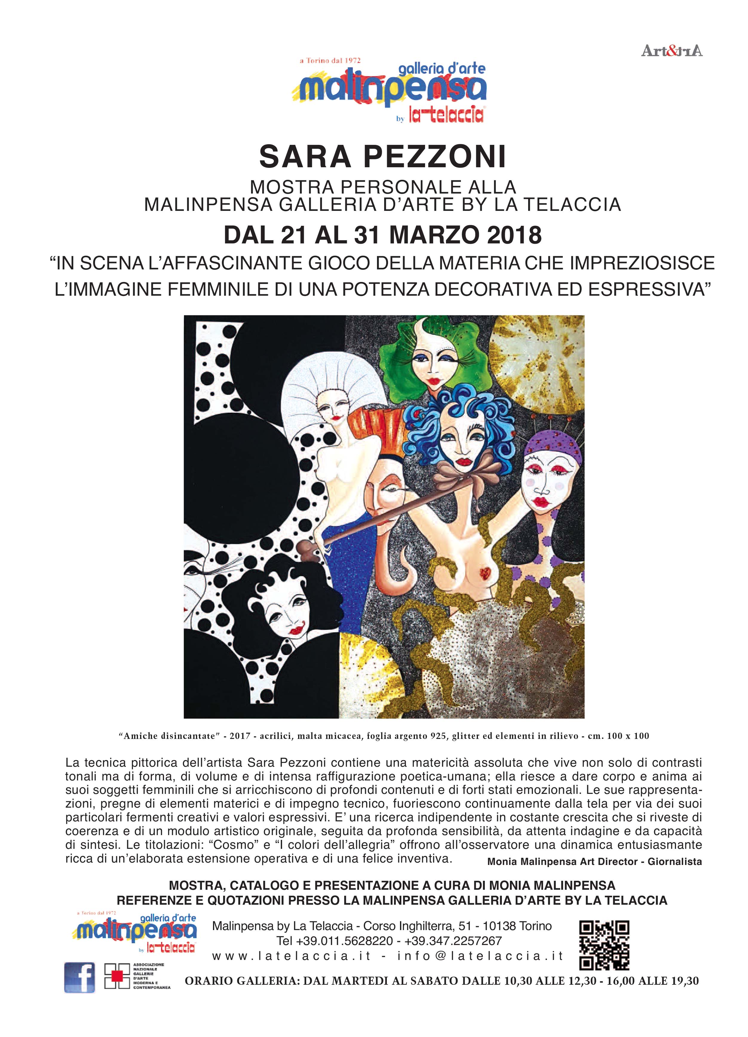 La tecnica pittorica dell’artista Sara Pezzoni contiene una matericità assoluta che vive non solo di contrasti tonali ma di forma, di volume e di intensa raffigurazione poetica- umana; ella riesce a dare corpo e anima ai suoi soggetti femminili che si arricchiscono di profondi contenuti e di forti stati emozionali. Le sue rappresentazioni, pregne di elementi materici e di impegno tecnico, fuoriescono continuamente dalla tela per via dei suoi particolari fermenti creativi e valori espressivi. E’ una ricerca indipendente in costante crescita che si riveste di coerenza e di un modulo artistico originale, seguita da profonda sensibilità, da attenta indagine e da capacità di sintesi. Le titolazioni: “Cosmo” e “ I colori dell’allegria” offrono all’osservatore una dinamica entusiasmante ricca di un’elaborata estensione operativa e di una felice inventiva.