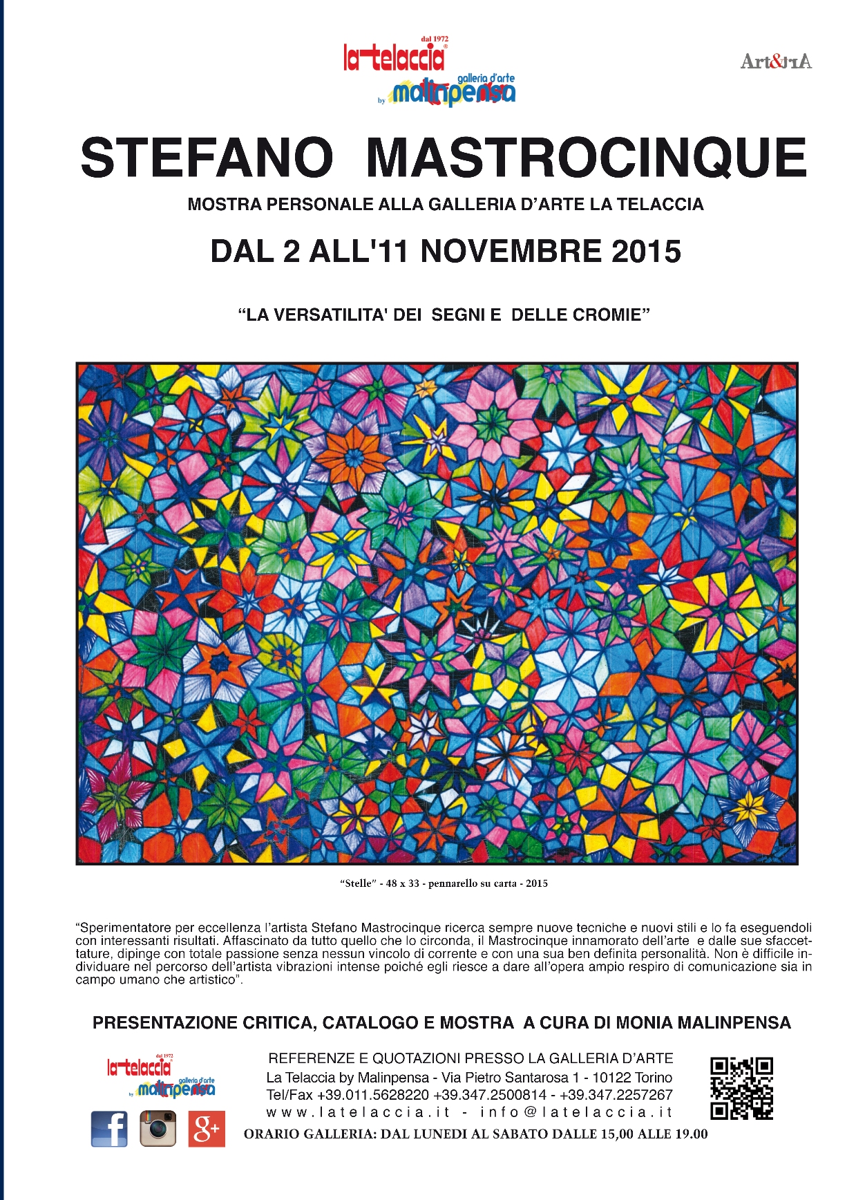 L’artista Stefano Mastrocinque si muove con un uso personalissimo e magistrale della tecnica a pastello e pennarello su carta; il fluire della materia, in continua evoluzione, genera nell’opera infiniti effetti cromatici di vibrante energia e di insolita fisicità. Egli, con una modalità pittorica affascinante, di grande forza e talento, si fa portavoce di una descrizione artistica interessantissima che lascia spazio ad una versatilità non comune. E’ una pittura al dì fuori dei soliti schemi, in continuo movimento ed assoluta ricerca stilistica a cui forma, colore e resa figurale conferiscono un grande valore artistico. Composizioni di figure geometriche, spirali, mosaici e simboli si rinnovano magistralmente nell’opera in un laborioso e complesso lavoro carico di studio e di una resa coloristica suggestiva, fino a raggiungere risultati di vera originalità e stile del tutto autonomo.